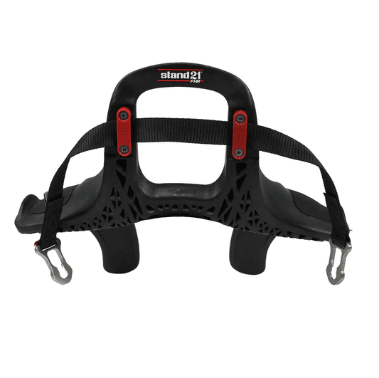 Hans Devices are 'U'- shaped devices that rest on the shoulders, extend over the chest, and wrap around the rear of the neck. This allows you to remove them while still attached to your helmet. One of the brands we offer is Stand 21. They have incorporated many comfort changes that are not available in other brands, like a softer yoke that contours to your neck and an improved quick-release system.