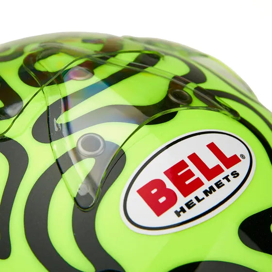 Bell have teamed up with F1 star Lando Norris to create this KC7-CMR karting helmet in fluro yellow and black. Norris worked closely with Bell's paint team to ensure the graphics and signature elements are closely matched to his own F1 helmet used in the 2024 season with the McLaren team. This Lando Norris edition version includes a 2mm multi layer green light smoke visor, top and side air intakes, rear spoiler.