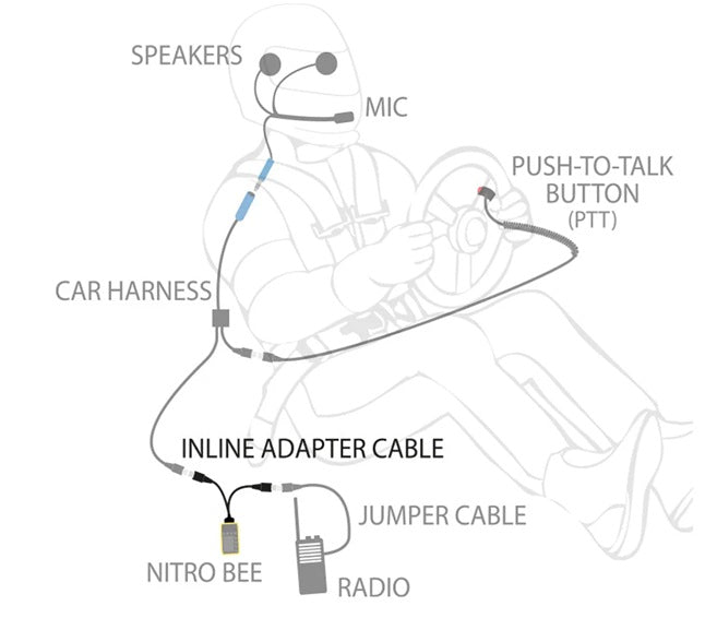 Rugged Radios Nitro Bee Extreme can be integrated with a single-seat car harness and two-way radio or 5-pin headset using this accessory cable.