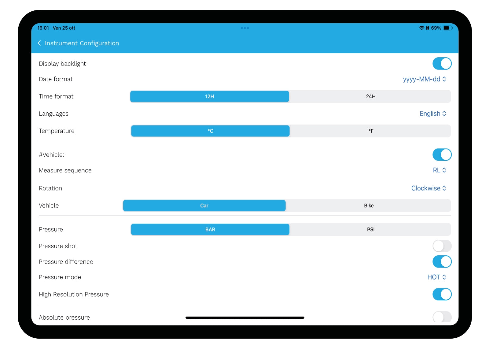 You can choose to store 8 pressure values (Cold and Hot) or just 4 pressure values. This is useful if you only want to measure Pit-Out or Pit-In pressures. Similarly, in Moto configuration, there will be only 4 or 2 pressure values.